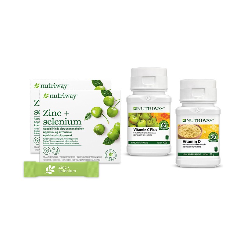 Nutriway Seasonal Immunity Support Bundle ger dig en väl avvägd daglig dos av vitaminer, mineraler och spårämnen och ger extra stöd vid de årstider som utmanar immunsystemet extra mycket. Nutriway Vitamin C Plus har en roll i immunförsvarets normala funktion, och Nutriway Zinc + selen bidrar till immunsystemets normala funktion och att bibehålla normal hud, hår och naglar. Samtidigt bidrar Nutriway Vitamin D till ditt immunsystem och att bibehålla normal benstomme och normala tänder. Det är ett smidigt paket med näringsämnen som är perfekt för alla som vill ge immunsystemet extra stöd.