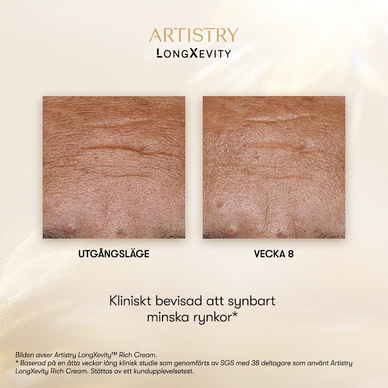 Artistry LongXevity-kollektionen stöder hudens naturliga förnyelsecykel och hjälper den att reparera, återfukta och boosta kollagen för en synbart yngre och fastare look. Med över 30 nyligen utvalda ingredienser och fler Nutriway™-växter än någon annan™ Artistry™-produkt tidigare – inklusive mjölktistel, vit chiafröolja, spenat och acerolakörsbär – kombinerar den här kollektionen naturens kraft med vetenskap. Det är din kompletta lösning för strålande och spänstig hud i alla åldrar, kliniskt bevisat att få huden att se upp till 17 år yngre ut.