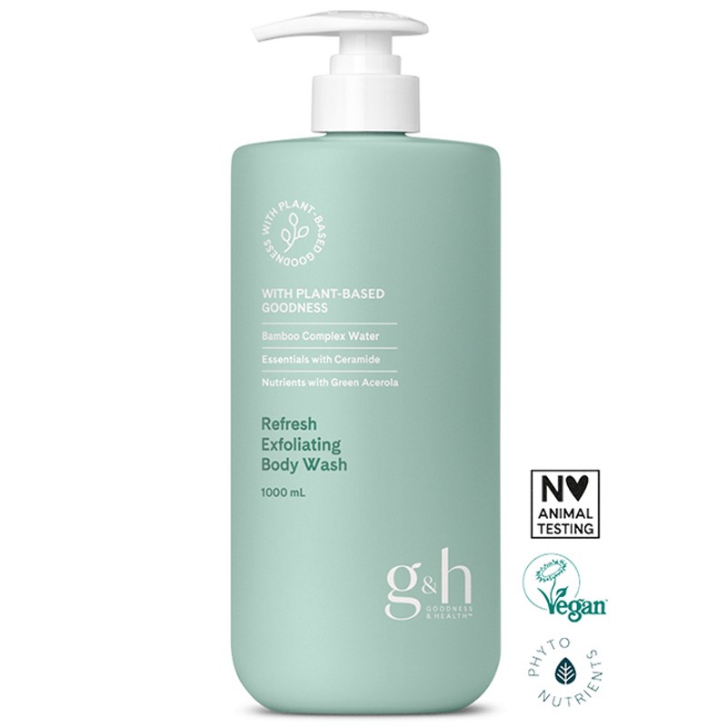 g&h Refresh Exfoliating Body Wash är en daglig exfolierande duschkräm med bambu-komplex-vatten, ceramider från olivolja, gröna acerolakörsbär och naturliga exfolierande ämnen. Den avlägsnar skonsamt orenheter och döda hudceller så att din hud känns uppfriskad och återfuktad.