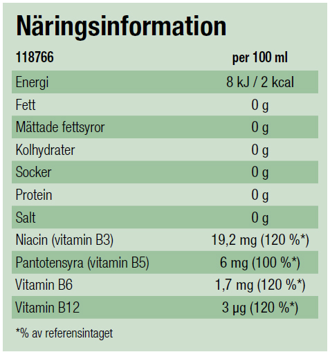 Niacin (B3), pantotensyra (B5), vitamin B6 och B12 bidrar till en normal energiomsättning och minskar trötthet och utmattning. Det är viktigt att äta en varierad och balanserad kost och ha en sund livsstil.