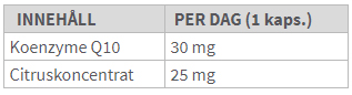 INGREDIENSER: maltodextrin, gelatin, koenzym Q10, citruskoncentrat (Citrus paradisi, Citrus reticulata x Citrus sinensis, Citrus limon), stabiliseringsmedel (mikrokristallinsk cellulosa, trikalciumfosfat), spirulinaconcentrat, klumpförebyggande medel (magnesiumsalter av fettsyror, kiseldioxid).