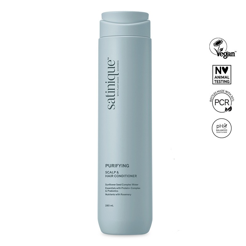 Purifying Scalp & Hair Conditioner Satinique™ demonstrerar den transformerande kraften hos växtdrivna ingredienser som är särskilt fördelaktiga för din hårbottens hälsa. Denna unika sammansättning är berikad med närande komponenter så som komplex-vattnet från solrosfrön, som ger essentiell återfuktning för att lugna och friska upp hårbotten samtidigt som den vitaliserar håret.