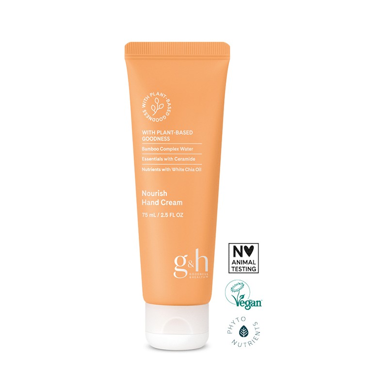 g&h Nourish Hand Cream är berikad med naturliga ingredienser som bambu-komplex-vatten, ceramider från olivolja, vit chia-olja och en hög koncentration av sheasmör. Den vårdar omedelbart och ger lindring åt torra, nariga händer samtidigt som den levererar ett skyddande lager av fukt till hudens yta,