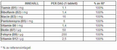 •En enda tvålagerstablett dagligen ger 100 % RI av alla åtta essentiella B-vitaminer: tiamin (B1), riboflavin (B2), niacin (B3), pantotensyra (B5), pyridoxin (B6), biotin (B7) folsyra (B9) och kobalamin (B12).