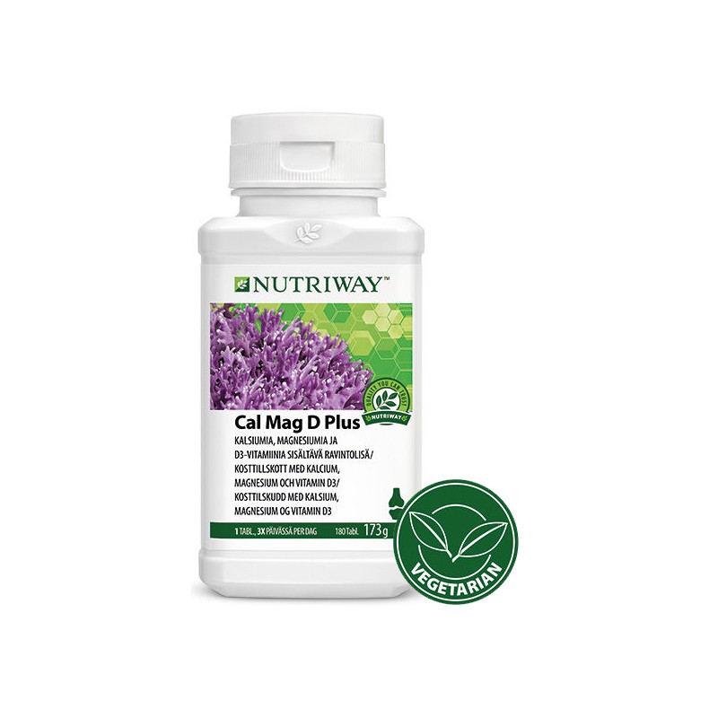 NUTRIWAY™ Cal Mag D Plus innehåller tre näringsämnen från naturliga källor – kalcium, magnesium och D-vitamin. Kalcium och magnesium behövs för att bibehålla normal benstomme. Produkten innehåller även D-vitamin som bidrar till normalt upptag av kalcium.