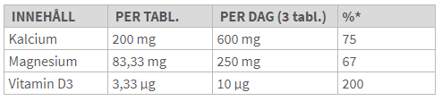 • Innehåller tre näringsämnen från naturliga källor – kalcium, magnesium och D-vitamin – som bidrar till att bibehålla normal benstomme.