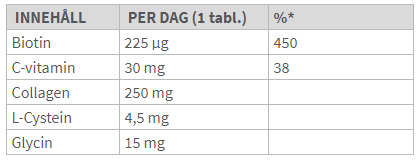 INGREDIENSER: hydrolyserad kollagen, stabiliseringsmedel (mikrokristallinsk cellulosa, dikalciumfosfat, tvärbunden natriumkarboximetylcellulosa, hydroxipropylmetylcellulosa), C-vitamin (L-askorbinsyra), maltodextrin, acerolakörsbärskoncentrat (Malpighia puncifolia), klumpförebyggande medel (magnesiumtrisilikat, magnesiumsalter av fettsyror, kiseldioxid), glycin, druvkärne-extrakt (Vitis vinifera), L-cystein hydroklorid, fuktighetsbevarande medel (glycerol), D-biotin, ytbehandlingsmedel (karnaubavax).