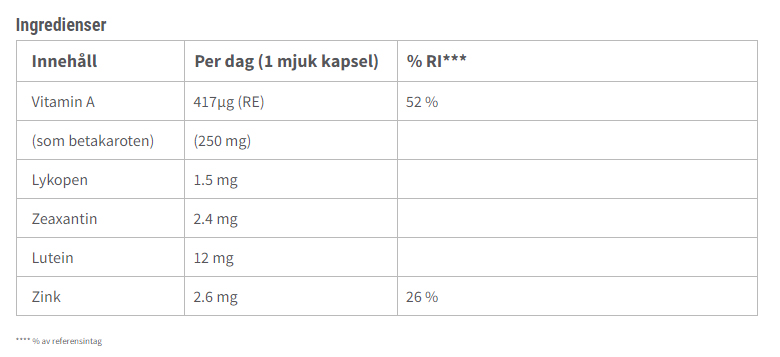 Kosttillskott i form av mjuka kapslar med vitamin A (betakaroten) och zink för att bidra till att bibehålla normal synförmåga*. Med 4 karotenoider från naturliga källor och zink.